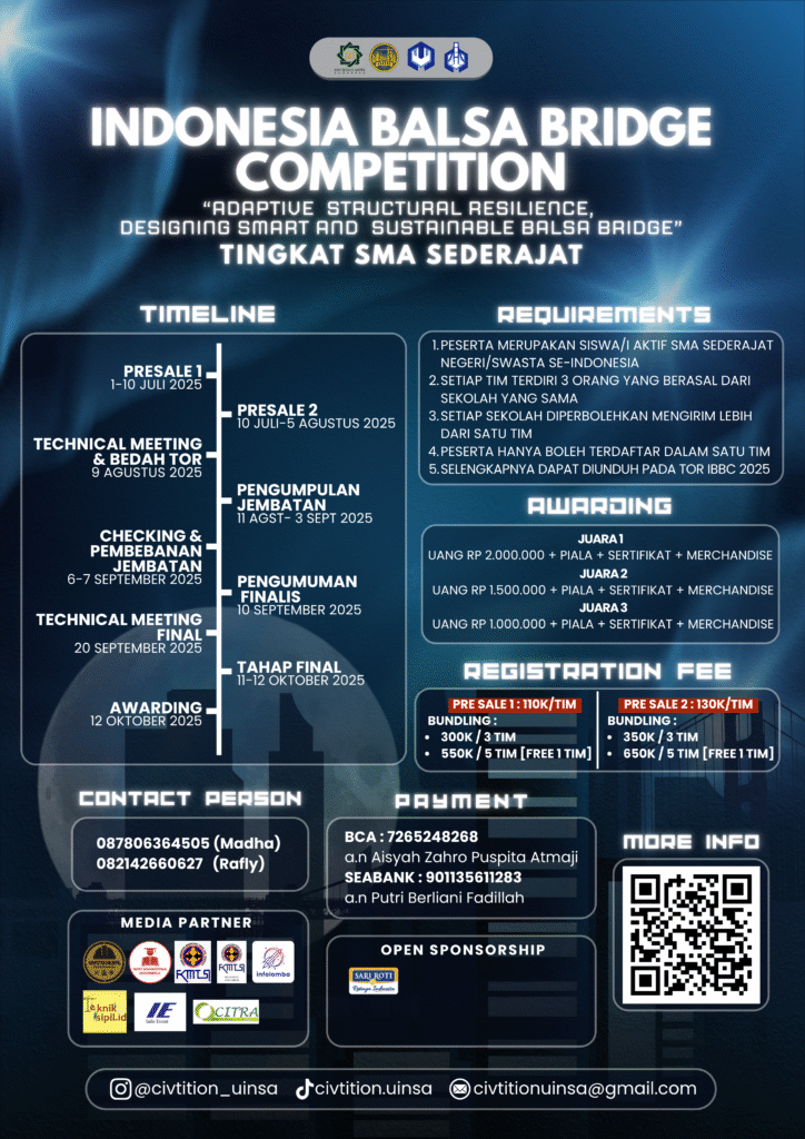 IBBCSMA SEDERAJAT (Indonesia Balsa Bridge Competition) Ajang kompetisi nasional jembatan balsa yang mengusung tema "Adaptif Struktural Resilience Desingning Smart and Sustainable Balsa Bridge" Pendaftaran Pendaftaran Download File Registration Form Term Of Reference Twibbon logo Contact Person SMA Sederajat MADHA Rafly