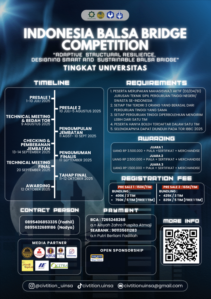 IBBCUNIVERSITAS (Indonesia Balsa Bridge Competition) Ajang kompetisi nasional jembatan balsa yang mengusung tema "Adaptif Struktural Resilience Desingning Smart and Sustainable Balsa Bridge" Pendaftaran Pendaftaran Download File Registration Form Term Of Reference Twibbon logo Contact Person Universitas Fadhil nadya
